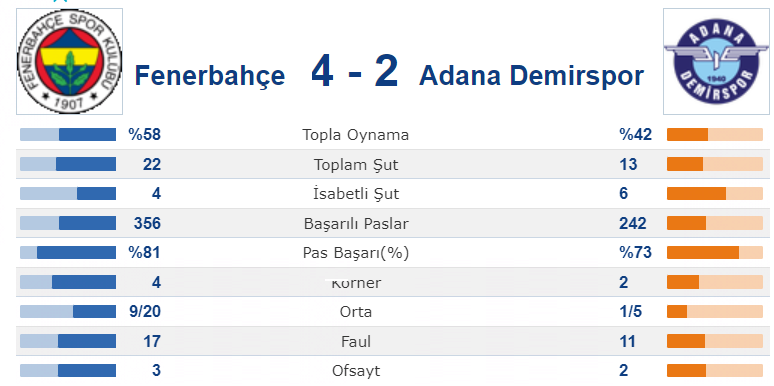 Mavi-Lacivertliler 90 dakikanın sonunda %42 topla oynadı. Adana Demirspor rakip kaleyi 13 kez yokladı. İstanbul ekibi ise maç içinde 22 şut attı. Adana Demirspor 242 başarılı pas yaparken, ev sahibi ekip ise 356 başarılı pas yapabildi.