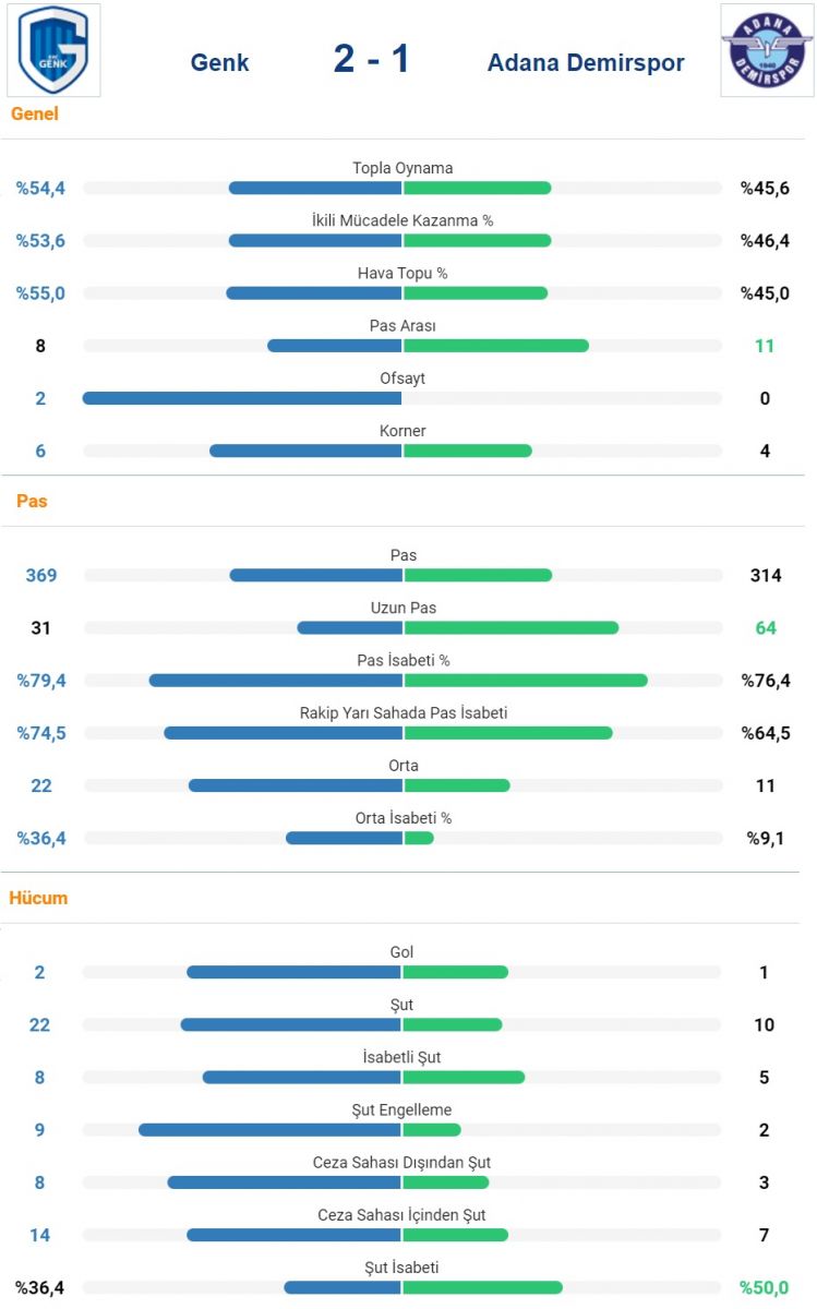Mavi-Lacivertliler 90 dakikanın sonunda %45 topla oynadı. Adana Demirspor rakip kaleyi 10 kez yokladı. Belçika ekibi ise maç içinde 22 şut attı.