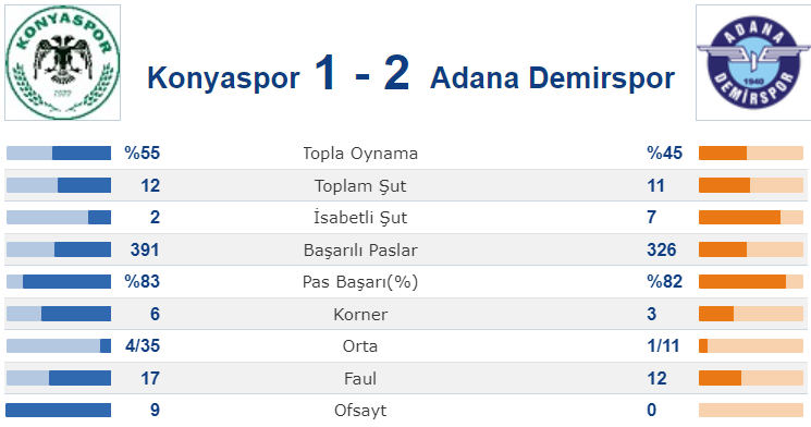 Mavi-Lacivertliler 90 dakikanın sonunda %45 topla oynadı. Adana Demirspor rakip kaleyi 11 kez yokladı. Konya ekibi ise maç içinde 12 şut attı. Adana Demirspor 326 başarılı pas yaparken, ev sahibi ekip ise 391 başarılı pas yapabildi.